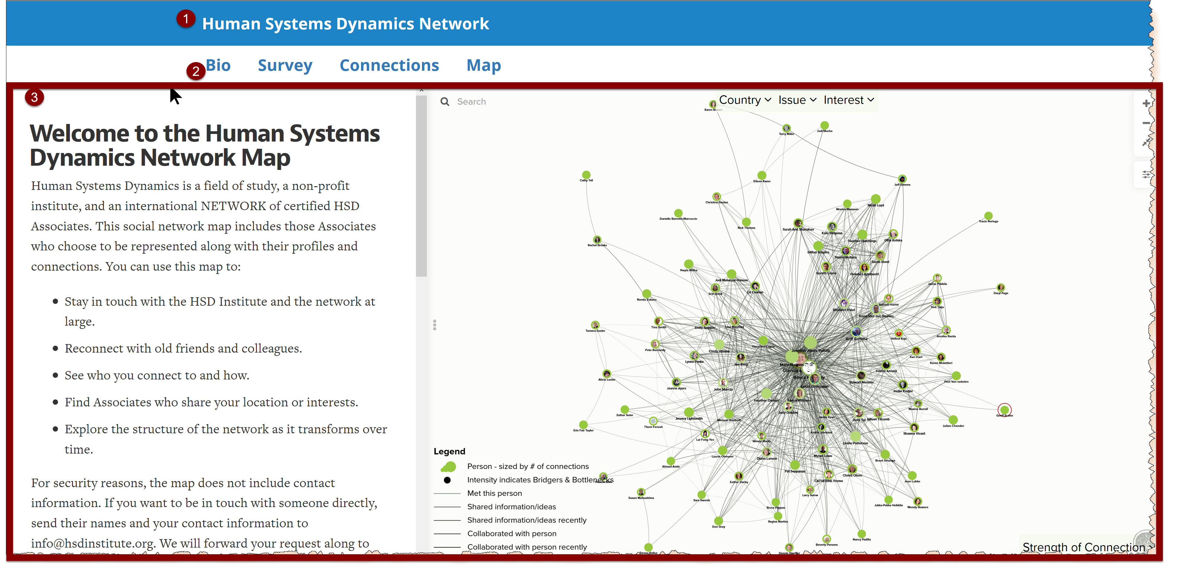 The map page is pretty simple - after the sumApp elements at the top (#1 and #2) , you see the interactive Kumu map interface (#3), which is almost the same as what you see when you log into Kumu.